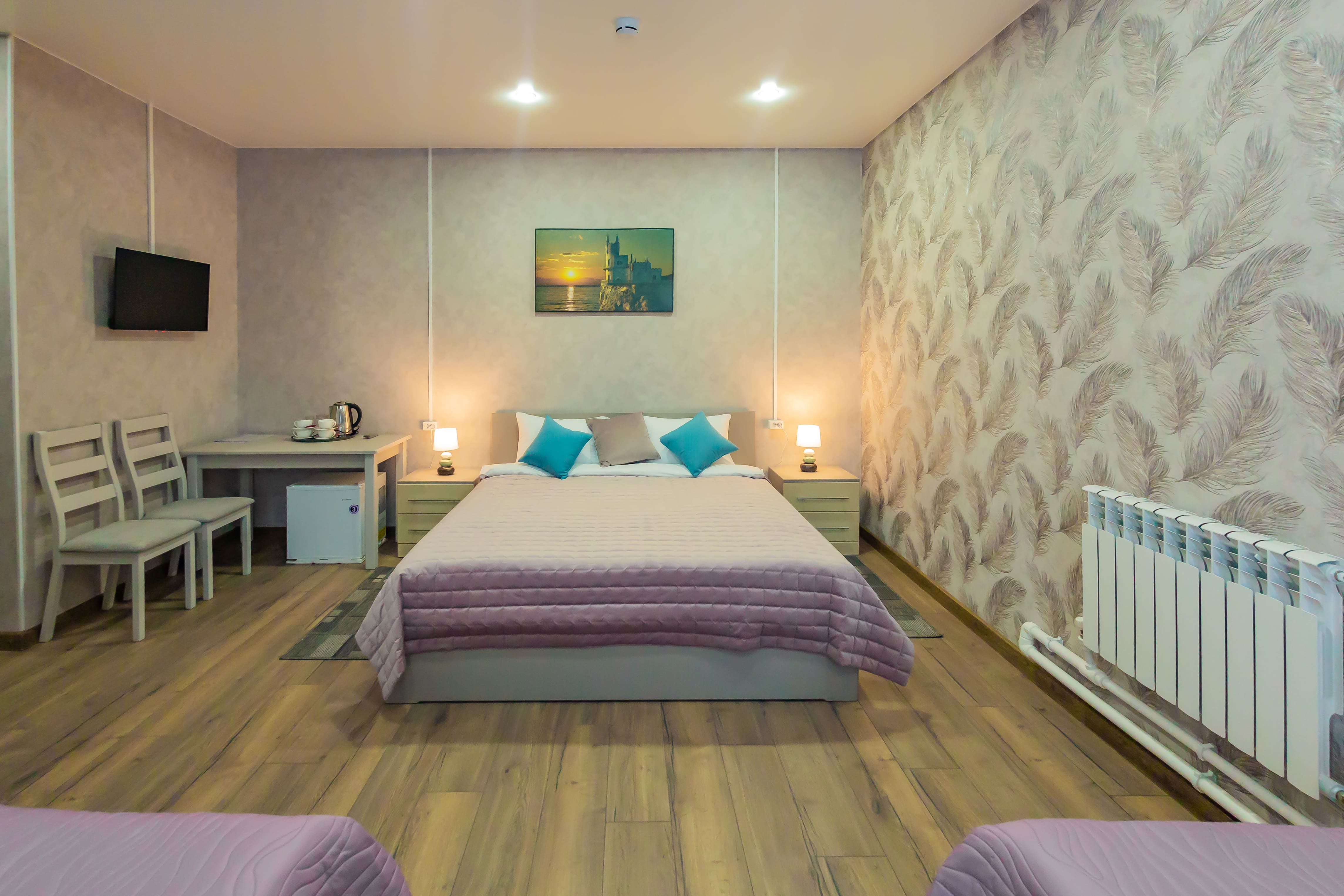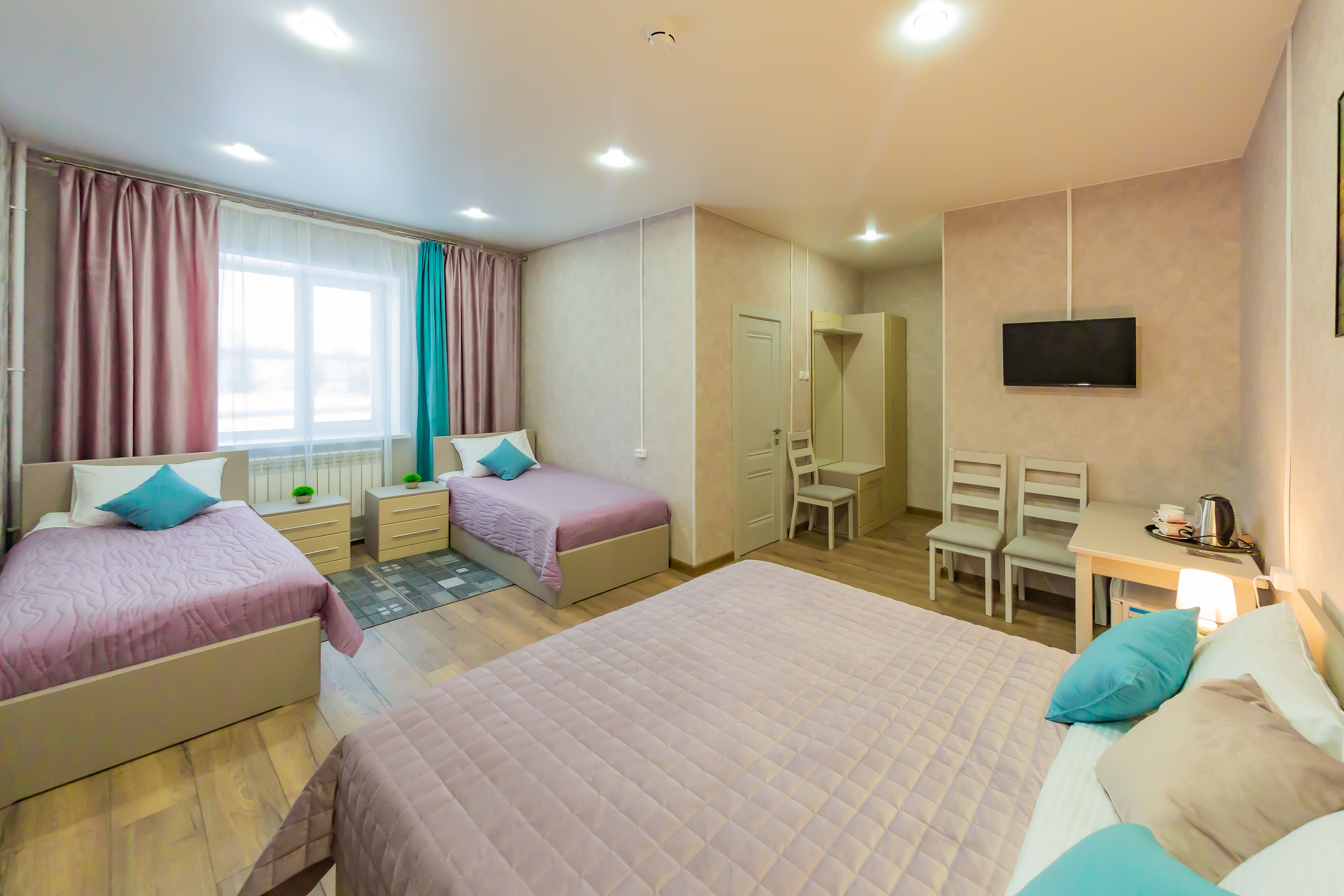 Стоимость в выходные: 5300 Мы рады предложить Вам просторный номер 25 кв.м. для комфортабельного отдыха. Этот номер идеально подойдет для семейного путешествия, а также для путешествия в компании друзей. Ощущение домашнего комфорта сделают ваш отдых незабываемым. Гостиничный номер рассчитан на 4 основных места: 1 двуспальная кровать и 2 односпальные кровати, доп. места не предоставляются. В номер можно разместить одного ребенка от 0 до 6 лет включительно (без предоставления места). Дети от 7 до 17 лет включительно размещаются на основных местах. Все номера гостиницы являются некурящими. УДОБСТВА В НОМЕРЕ: - 1 двуспальная кровать и 2 односпальные; - шкаф для одежды; - прикроватные тумбы; - светильники; - стол; - табуреты; - телевизор c плоским экраном; - вентилятор; - зеркало; - отопление; - москитная сетка; - гладильная доска и утюг по запросу; - стаканы, чашки, блюдца, чайные ложки; - чайник по запросу; - холодильник; - WI-FI ВАННАЯ КОМНАТА: - шкафчик с зеркалом; - стаканчик для зубных щеток; - мыльница; - душевая кабина; - раковина; - туалет; - фен; - полотенца; - туалетные принадлежности.